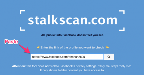 Đầu tiên, copy link facebook của người cần theo dõi và dán vào ô tìm kiếm trên Facebook Scanner như sau:
